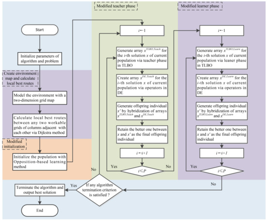 In real-world applications, major efforts have concentrated on strengthening by hybridizing one candidate bionic intelligent optimization algorithm with other sophisticated skills. The ACO is one example: some of the most recent ACO-based path-planning algorithms are reviewed as follows. To reduce search blindness, Zhao et al. [11] embedded the directional, heuristic information and unevenly distributed initial pheromone into the ACO architecture. The rollback strategy was introduced by Wu et al. [12] to make more ants reach the goal, and the death strategy was also utilized to reduce the influence of an invalid pheromone on the algorithm evolution. Wang et al. [13] designed an improved, pseudo-random proportional rule for the ant state transition which greatly improved the convergence speed. A novel penalty strategy to volatilize the poor path pheromone was embedded into the ACO by Yue et al. [14], which efficiently improved the utilization rate of the ant exploration. Chen et al. [15] tried to improve the visibility of heuristic information by virtue of the principle of infinite step length. In addition, the pheromone update rules, as well as the evaporation rate, were dynamically adjusted to accelerate the convergence speed. The evaluation function of the A-star algorithm and the curvature suppression operator were introduced into the ACO by Dai et al. [16]; these additions were in favor of accelerating the convergence and improving the smoothness of the final path. Luo et al. [17] proposed an attenuation-factor-based heuristic information mechanism, and adjusted the pseudo-random ratio of state selection by means of an adaptive function. The adaptive adjustment factor and pheromone volatilization factor were embedded into the pheromone update rule by Miao et al. [18]. Such modifications efficiently balanced the global search ability and convergence. As can be noted from the above literature, different skills have been embedded into the basic algorithm with respect to the aspects of path formulation, path adjustment, solution modification, individual update, etc. The proposed ETLBO is motivated and designed by these observations and is developed by virtue of TLBO.