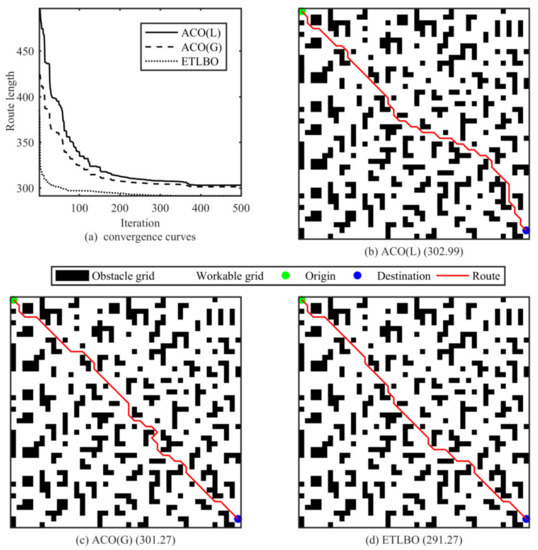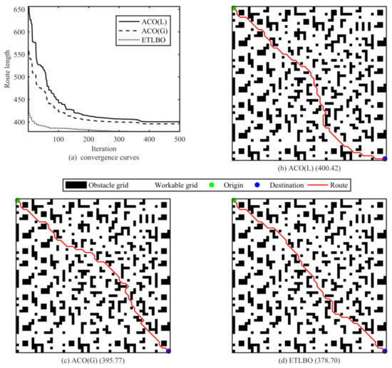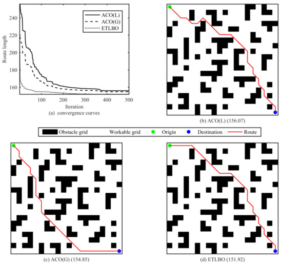 - For instance 20 × 20, it can be seen from Figure 6 that ETLBO yielded the best solution performance of the three test algorithms, with the best route length of 151.92 (Figure 6d). ACO(G) performed second to ETLBO, with the best route length of 154.85 (Figure 6c). ACO(L) showed the weakest performance in the best route length, with an objective value of 156.07 (Figure 6b);