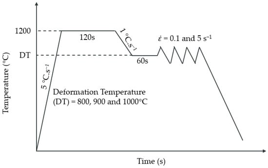 For thermomechanical testing, the alloys were machined into rectangular test samples of 10 × 10 × 7 mm configurations before subjecting them to rectangular axial isothermal compression testing on a Gleeble 3500 thermomechanical simulator. A platinum-rhodium (R-type) thermocouple was then welded to the mid-span of the samples. Nickel paste and graphite foil were applied in between the tungsten carbide ISO-T anvils and the samples to minimize frictional effects on the flow curves. Figure 1 shows the thermomechanical processing schedule applied to the samples. Three deformation temperatures of 800, 900, and 1000 °C and two strain rates of 0.1 and 5.0 s−1 for each temperature were used. These parameters were selected from previous studies [13,14,15] and were considered safe for the hot working of Fe-Mn-Al-C low-density steels. Prior to deformation, the samples were heated at a rate of 5 °C/s up to a reheating temperature of 1200 °C and then soaked for 120 s to achieve homogenization at the reheating temperature. Thereafter, the samples were cooled to the deformation temperature at a rate of 1 °C/s and held for 60 s before deformation. All the samples were deformed to a total strain of 0.5 followed by compressed air quenching. The stress–strain data were then captured and analyzed.