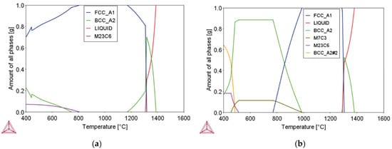 Phase prediction from Thermo-Calc for (a) Fe-30.9Mn-4.9Al-4.5Cr-0.4C; (b) Fe-21.3Mn-7.6Al-4.3Cr-1C.