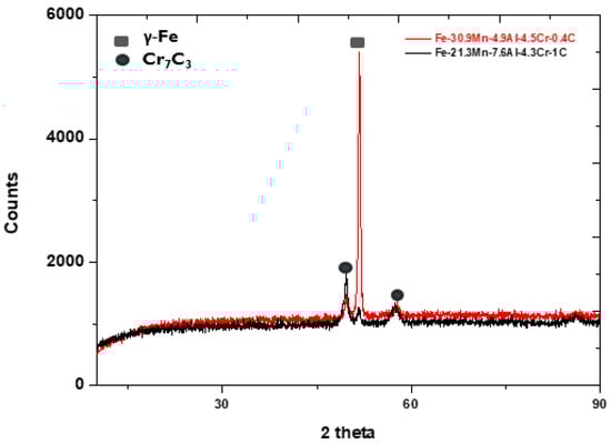 Figure 3 presents the Thermo-Calc predictions showing the alloys’ expected equilibrium phases. Below the solidus, α-Fe (bcc), γ-Fe (fcc), and M23C6 carbide are expected in Fe-30.9Mn-4.9Al-4.5Cr-0.4C alloy, while α-Fe (bcc), γ-Fe (fcc), and carbides of M7C3 and M23C6 are expected in Fe-21.3Mn-7.6Al-4.3Cr-1C alloy under equilibrium conditions. However, the prominent peaks in the XRD patterns (Figure 4) confirmed the presence of γ-Fe (fcc) and Cr7C3 (M7C3) in both alloys. Ferrite and M23C6 phases were not identified in either alloy. This could be due to the low volume fraction of the M23C6 phase in the alloys. XRD cannot detect phases less than two volume percent [17]. In addition, a longer XRD scan may have picked up the ferrite phase in Fe-30.9Mn-4.9Al-4.5Cr-0.4C alloy.