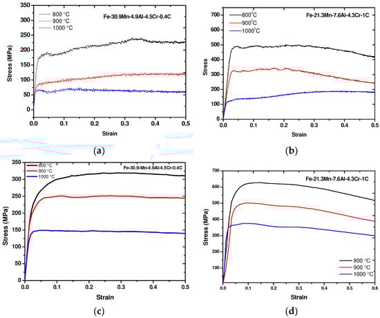 Flow stress at different deformation temperatures for Fe-30.9Mn-4.9Al-4.5Cr-0.4C (Sample A) at (a) 0.1 s−1 and (c) 5 s 1; Fe-21.3Mn-7.6Al-4.3Cr-1C (Sample B) at (b) 0.1 s−1 and (d) 5 s−1.
