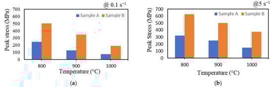 Extracted peak stresses from flow curves for alloys Fe-30.9Mn-4.9Al-4.5Cr-0.4C (Sample A) and Fe-21.3Mn-7.6Al-4.3Cr-1C (Sample B) deformed at different temperatures and constant strain rates of (a) 0.1 s−1; (b) 5 s−1.