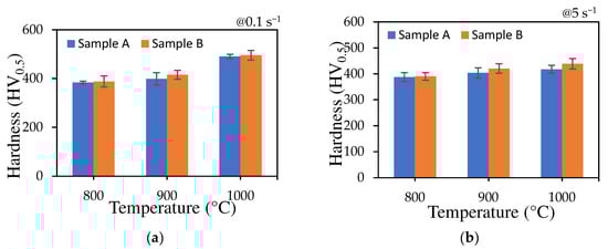 The hardness of Fe-30.9Mn-4.9Al-4.5Cr-0.4C (Sample A) and Fe-21.3Mn-7.6Al-4.3Cr-1C (Sample B) deformed at different temperatures and constant strain rates of (a) 0.1 s−1; (b) 5 s−1.