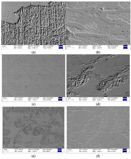 Scanning electron microscope images of deformed Fe-21.3Mn-7.6Al-4.3Cr-1C under different deformation conditions: (a) 800 °C at 0.1 s−1; (b) 800 °C at 5 s−1; (c) 900 °C at 0.1 s−1; (d) 900 °C at 5 s−1; (e) 1000 °C at 0.1 s−1; (f) 1000 °C at 5 s−1.