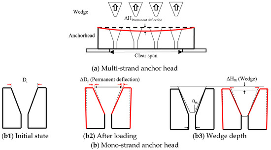 PTI [11] contains performance standards with a stable margin for safety that are meant to reduce the damage to the anchor head due to the tension introduced into the strand. A static load test of the anchoring system is recommended, including the anchorage devices and the strands, with unloading after loading 95% of the minimum tensile strength (MUTS) of the strands, followed by an evaluation of any permanent deflection of the anchor head after disassembly of the anchoring components. The permanent deflection is measured at the top of the anchor head, as shown in Figure 1a, and the corresponding allowance criteria should not exceed 1/600th of the clear span. However, it is difficult to evaluate the performance of a mono-anchor head by applying the aforementioned method. Instead, the residual deformation around the wedge hole can be taken as a parameter of performance for a mono-anchor head because the permanent deflection of the anchor head is closely related to deformation of wedge holes.