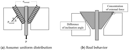 The anchorage device for single strands consists of a wedge and a mono-anchor head. When the strand is tensioned, the wedge is drawn into the anchor head together with the strand and transmits the tensioning force to the inclination inside the anchor head. As shown in Figure 2a, assuming that the inclination angles of the anchor head and wedge are the same, the normal stress is uniformly distributed over the entire inclined surface of the anchor head. The normal stress of the anchor head inclined surface is the load transmitted through the wedge () divided by the inclined surface area of the anchor head () as in Equation (2). The load acting perpendicular to the inclined surface is calculated by Equation (3). In this case, P is the load on the strand, is the inclination angle of the anchor head, α is the friction angle between the wedge and the anchor head, and the friction coefficient () is defined as μ = tan(α) [14,15,16].