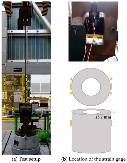 Finite element modeling that reflects the behavior of an actual anchorage device is important to establish the stress and strain characteristics occurring at a specific location of the mono anchor head. Therefore, the static load test of the anchoring system using the anchor head of the shape shown in Figure 3 and Table 1 was performed in advance to understand the behavior characteristics of the actual mono-anchor head. The test was performed, and the deformation characteristics of the anchor head according to the applied load were identified by attaching a strain gauge to the outer surface of the mono-anchor head. As shown in Figure 4a, a three-piece wedge and a mono-anchor head were used at both ends of a 2360 MPa strand with a free length of 1500 mm. The load was measured on the universal test machine, and the displacement was measured as the movement of the UTM crosshead. The strain gauge attached to the mono-anchor head measured the strain in the hoop direction as shown in Figure 4b. In order to eliminate undesired initial set-up error, the test specimens were loaded and unloaded three times up to 50 kN and then loaded until the strand failed. Two specimens were prepared and tested to establish reliable behavioral characteristics for all specimen groups.