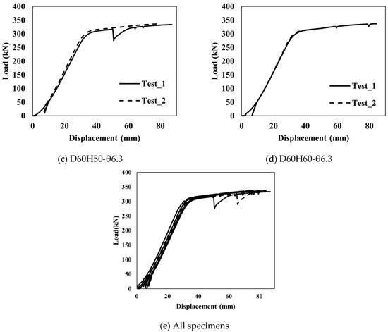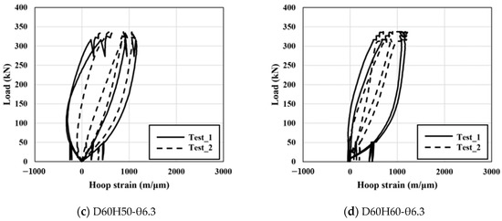 The load-displacement curve for each specimen is shown in Figure 5. When the load-displacement curves of all specimens are compared, as shown in Figure 5e, the behavior characteristics according to the configuration of the mono-anchor head cannot be discriminated, and it can be confirmed that only the dominant behavior appears in the strand. On the other hand, the results of strain measurement in the hoop direction measured to specify the behavior of the mono-anchor head are shown in Figure 6, according to the load applied to the strand. It can be confirmed that the individual strains attached to the same specimen show non-constant result values. This is considered to be the effect of the wedge placed inside the anchor head, and should be specifically considered through analysis when investigating the behavior according to the design variables of the anchor head.