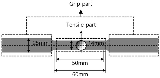 The specimen for the tensile test was manufactured according to the standard dimensions in ISO 6892-1 [20]. The specifications of the tensile test specimen are shown in Figure 7. Three specimens were manufactured and tested for each of the two variables according to the carburizing process. The stress-strain curves for two carburizing parameters are shown in Figure 8, and the average yield and ultimate strengths of the three specimens with the same parameters were computed, as shown in Table 2. With carburization, the ultimate strength of the material increased by 40% and the yield ratio increased by 20%.