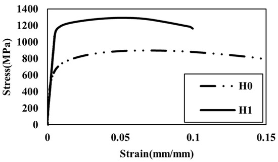 Conventionally, the material used for anchor heads is C45 [18], which has a yield strength of 340 MPa; stress in the local region of the anchor head will inevitably exceed the yield strength. Therefore, in this study, a carburized 42CrMo4 [19] anchor head was adopted to increase the yield strength and reduce inelastic deformation during tensioning of strands. Tensile tests were conducted on non-carburized (H0) and 1 mm-deep carburized specimens (H1) in an effort to understand the effect of carburization. During the carburizing process, the surface is hardened by the carbon penetrating into a surface layer, and the carbon content decreases as the depth increases from the surface, resulting in lower yield strength and hardness. In order to consider the hardened layer with higher strength in FEM modeling, the mechanical properties for each layer should be defined. In this study, hardness tests for H0 and H1 were conducted, and correlation between the strength and hardness was used to indirectly identify the material properties in each layer of heat-treated anchor heads.