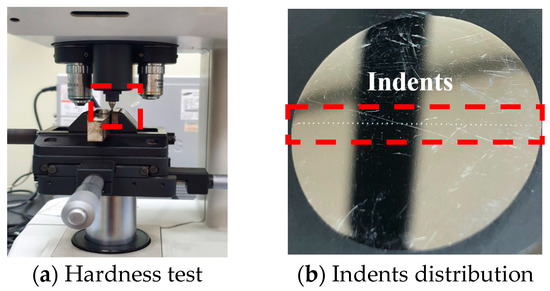 In the cross-section of the carburized steel, the hardness decreases linearly up to a certain depth from the surface according to the carbon content and remains constant at a depth beyond that point [21,22]. Here, a hardness test was conducted to identify the degree of hardening according to the depth from the surface. A grip part of a circular cross-section of a tensile test specimen was cut, and the Vickers hardness was measured at 0.5 mm intervals from the surface of the test specimen, as shown in Figure 9.