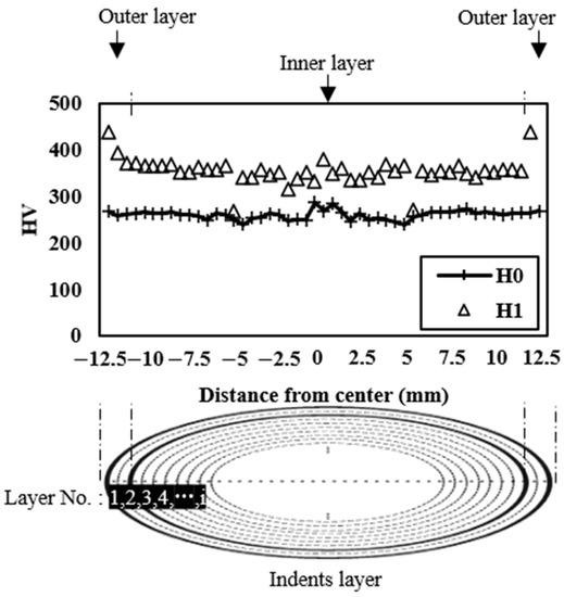 The effective hardness () values of the outer and inner layer are average values calculated by weighting the area of each layer () with the hardness at each indent (). This is expressed by Equation (7).