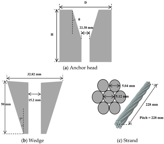 In this study, in order to analyze the behavior of the anchor head, considering the interaction between components of the anchorage system, detailed modeling of the individual parts was conducted. All individual steel wires were modeled according to the standard of seven-wire strands presented in ASTM A416 [24]. The geometric properties of the strand wire, wedge, and anchor head are shown in Figure 11, and the variables of the outer diameter, height, and surface inclination angle of the anchor head are the same as those performed in the static load test.