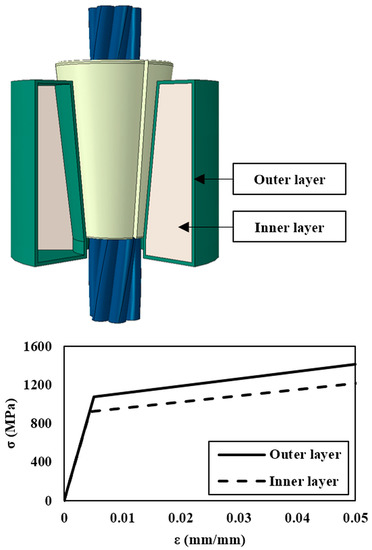 The material properties of the carburized 42CrMo4 anchor head were assigned to 1 mm thick outer and inner surface layers as shown in Figure 12. The wedge was made of AISI 4320 steel, and the yield and tensile strength were obtained through uniaxial tensile tests. To assess the strength of the seven-wire strand, the nominal strength specified ISO 6934-4 [25] was referenced. The outer wire of the strand under axial load exhibits not only tensile behavior, but also torsional behavior due to the helical geometry [26]. The nominal strength of the strand takes into account the loss due to torsion of the individual wire, so the strength of the wire should be higher than the nominal strength of the strand in ISO 6934-4 [25]. Therefore, the strength of the individual steel wires was adjusted to match the stress-strain curve of the static load test. The material properties of the anchor head, wedge, and individual wire are described in Table 5.