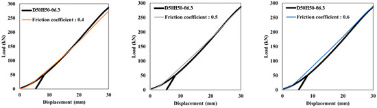 The anchoring mechanism of the strand is as follows. When a load is applied to the strand, the wedge holding the strand slides along the inner slope of the anchor head, and the normal stress transmitted to the strand increases as the applied force increases. At this moment, the saw teeth existing on the inner surface of the wedge grasp the strand strongly, with the result being that it behaves almost as a single part. Accordingly, the saw teeth are not modeled, and a ‘rough’ property of Abaqus is applied with regard to the interaction between the wedge and the strand to prevent the parts from separating. A ‘penalty’ algorithm is used to implement the interactions between the individual wires constituting the strand, and the interaction between the anchor head and the wedge via friction contact. The coefficient of friction at the contact surface between steel materials is usually evaluated as 0.3 to 0.7 in a dry condition [27]. The friction coefficient between the strands was applied at 0.3, and the analysis was performed by changing the friction coefficient to 0.4, 0.5, and 0.6 for the wedge-anchor head interface, which can significantly affect the behavior of the anchorage device. The result was compared with the static load test result as shown in Figure 13; when the friction coefficient was 0.5, it showed the most similar behavior to the specimen used in the test. Additionally, the wedge and the inner surface of the anchor head have a single differential angle, meaning that the contact area changes due to the deformation of the individual parts according to the increase of the load step. ‘Interference fit’ was applied to improve the convergence of the analysis. As the load is applied, the wedge holding the strand slides inside the anchor head and then transmits the radial, and axial stress to the anchor head. As shown in Figure 14, the z-axis was constrained with respect to the bottom surface of the anchor head. For loading, a displacement-controlled method was used. Displacement was applied in the axial direction relative to the ends of the strands. In order to reduce computational time, a free length of 147 mm for the strand was modeled.