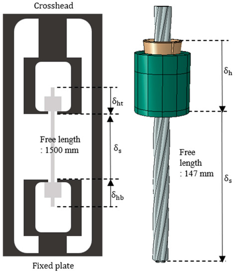 As shown in Figure 15, the total displacement in the anchoring system includes not only the increased length of the strand, but also the slip displacement between the anchor head and the wedge [28]. The analysis model that has a shorter free length was calibrated for comparison with the displacement measured in the static load test.