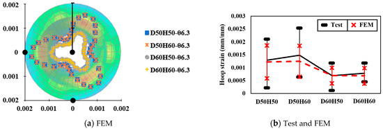 In the load-displacement curve obtained from the finite element analysis results, the point where the stiffness changes at the beginning of the load in the elastic section is found. This is the effect of ‘interference fit’ applied to control the analysis error that occurs between the contact between the wedge and the anchor head. It is not a matter to be considered because it is not an area of interest to be obtained through analysis. In the load-displacement relationship obtained from the test and finite element analysis, since the displacement ratio of the strand is dominant compared to the total displacement, the material properties of the strand can be verified. The load displacement from the test and the corrected analysis results are shown in Figure 16, and showed good agreement. In addition, the measured hoop strain was compared to specify the behavioral characteristics of the anchor head. Prior to comparison, the hoop strain of the outer surface of the anchor head obtained from the FE analysis is shown in Figure 17a. When a piece of three-piece-wedge slides into the anchor head, the amount of strain appears differently depending on the contact position with the wedge. Since this strain distribution has unique characteristics depending on the design parameters of the anchor head, it is desirable to verify the analytical model by comparing it with the strain distribution in the test. Figure 17b shows the maximum, minimum, and average values according to the design variables of the hoop strain obtained in the test and FE analysis. The maximum and minimum hoop strains show some differences, but on average, show similar results. This may be attributed to imperfect settlement of the wedge in the anchor head. However, since the overall tendency is similar, the modeling method of the anchor head can be evaluated as well reflecting the actual behavior.