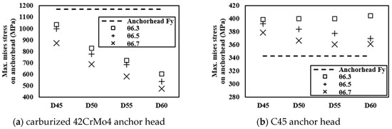 In total, 72 models were analyzed to assess the behavior of the anchor head. With the combination of the diameter, height, and inclination angle shown in Table 6, two materials with 36 configurations were used for the models. Carburized 42CrMo4 and C45 were used. The yield strengths were 1170 MPa and 340 MPa, respectively. The behavior of the anchor head according to the design variables was compared under 95% of the MUTS of the strand, the standard load suggested for a performance evaluation by PTI [11]. At this time, the maximum von-Mises stresses were compared in the anchor head in the triaxial state due to the axial stress and the circumferential and radial stresses. In addition, the plastic hoop strain at the top of the wedge hole, which is the performance parameter, was extracted and compared with the acceptance criterion.