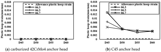At the top of the wedge hole in the anchor head, the load was concentrated, the maximum stress occurred, and it showed different patterns depending on the configuration. Figure 18 shows the maximum stress according to the configuration of the anchor head for each material, and the resulting plastic strain is shown in Figure 19. The effect of the height was insignificant, and thus only the effects of the diameter and inclination angle are compared. The stress of the anchor head using the carburized 42CrMo4 did not exceed the yield strength and only showed elasticity. Accordingly, plastic hoop strain did not occur at all. On the other hand, the stress of the anchor head using C45 exceeded the yield strength locally and exceeded the allowable plastic hoop strain in all configurations. It can be implied that the carburized 42CrMO4 anchor head has excessive strength, but the C45 anchor head needs improvement in strength for use with 2360 MPa high-strength steel strand.
