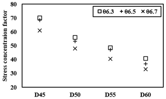 The maximum stress obtained by parametric analysis refers to the stress at the top of the wedge hole. The concentration of external force was compared with the maximum stress of the 42CrMo4 anchor head to be quantified based on Equation (6), calculated in Chapter 3. Concentration factor (k) is distributed according to the diameter and inclination angle as shown in Figure 20, and Equation (12) was derived so that it can be calculated by those parameters. Therefore, when the diameter and internal inclination angle are determined, the concentration factor can be calculated using Equation (15) and the maximum stress during elastic behavior can be calculated by applying the calculated concentration factor to Equation (6).