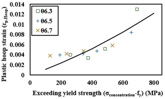 Then, the relationship between the plastic hoop strain distributed in the C45 anchor head and the stress exceeding the yield strength was established. In Figure 21, the x-axis is the yield strength excess stress, and it is calculated as the difference between the maximum elastic stress for each configuration and the yield strength of the anchor head. The y-axis represents the plastic hoop strain occurring at the top of the wedge hole due to the stress exceeding the yield strength. The points shown in the graph were derived as a quadratic equation with 0 as the y-intercept as in Equation (16).