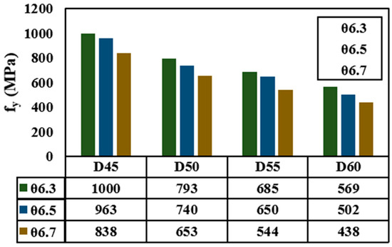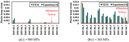 Taking into account the relationship between the yield strength and the plastic hoop strain, an additional FE analysis was performed for verifying Equation (16). The arbitrary designated yield strength values are 343 MPa and 800 MPa, and the calculations of the plastic hoop strain for each configuration based on Equation (16) and the FE analysis results were compared. The two verification results are described in Figure 22a,b, respectively. In the proposed equation, when the difference between the elastic maximum stress () and determined yield strength () of the same configuration exceeds 300 MPa, the plastic hoop strain overestimates compared to FEM; when it is below 300 MPa or exceeds 700 MPa, the plastic hoop strain is underestimated compared to FEM. However, all cases here show similar results and it is judged that there will be no limit when evaluating whether the plastic hoop strain allowance is met. Based on the equations proposed in this paper, anchor head design parameters with safe performance can be determined. Figure 23 shows the minimum yield strength of steel that can be applied according to the shape of the anchor head.