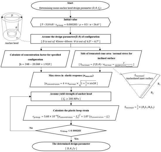 In this paper, the behavior characteristics of the anchor head were investigated in advance by finite element analysis that reflects the actual behavior based on the static load test. Based on the investigated behavior characteristic, it is possible to evaluate the performance of the anchor head according to the design parameters of the anchor head. The simplified procedure determining design parameters of the diameter, angle of the inclined surface, and yield strength of the anchor head to meet the safety performance specifications of a mono-anchor head is illustrated in the flowchart in Figure 24. The following procedure can be applied in the anchoring system using the 2360 MPa strand and three-piece wedge.
