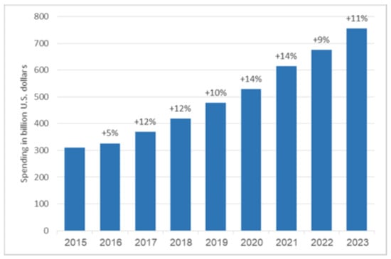 According to a Statista report [], expenditures on global information technology (IT) by companies in various sectors grew annually between 2015 and 2022, as shown in Figure 1. Forecasts indicate an expected rise of 11% in 2023 due to the continued expansion of new technologies. In particular, several technological categories, including robotics and artificial intelligence, are likely to expand to represent more than 25% of IT spending worldwide, and next-generation security linked to those new technologies will also encourage significant growth (see IDC—Global ICT Spending Forecast []).