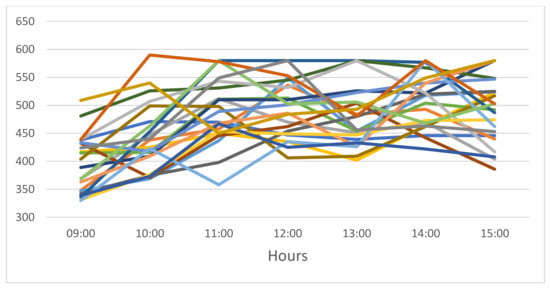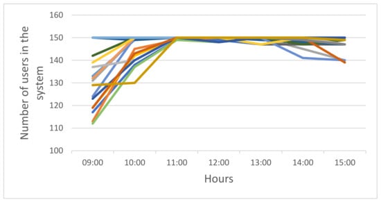 The main parameters of the calibration system are summarized in Table 2. Based on Figure 6, the average rate of NNU license requests by = 580 heavy users (of = 700 heavy users) is per hour, that is, and, therefore, the overall average rate of use of NNU licenses by heavy users is . The average number of requests for a floating license (Figure 5) by all light users (946) and 120 heavy users ( − = 700 − 580 = 120) during peak hours is . Consequently, using Equation (9), we can calculate the average rate of requests by all light users: .
