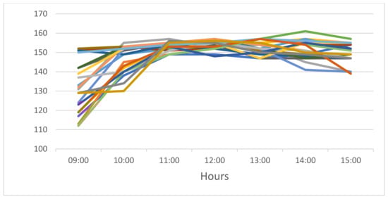 In November 2020, CO had = 580 NNU licenses and = 150 floating licenses. Figure 2 presents the dynamics in number of floating license users in November 2020 during the most active business hours (9:00 to 15:00); each color in the figure represents a different day in November. As shown, CO’s MATLAB software is used intensively and some users are occasionally blocked during the week.