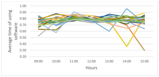 The duration of license use by peak hour in November 2020 is depicted in Figure 7. Using these data, we calculate the average user’s working time accessing the software as = 0.847 h ( = 1.18).