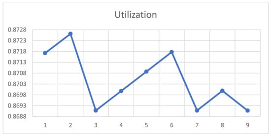 Table 4 (Case 2) depicts the top nine portfolios under the 5% decrease in rate of requests per hour. Under the same utilization frontier of 86.9% to 87.3%, the least costly portfolio is P−9 ( = 574, = 147), which costs about 41,544 dollars less than the company’s current portfolio. Under the more restrictive utilization constraint of 87.2%, the best portfolio is P−5 ( = 574, = 147), which costs about 5000 dollars less than the company’s current portfolio.