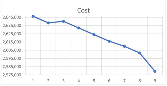 As shown in Figure 10, the lowest-cost portfolio is P9 ( = 587, = 145), which is about 36,500 dollars less than the CO’s current portfolio (P6, = 580, = 150). This result arises because of a smaller number of the floating licenses ensuring similar rejection probability and utilization, so it meets both the constraints (see Figure 8 and Figure 9). When the company’s target utilization is more restrictive—87.2% instead of 86.9%—under the same rejection probability frontier, the lowest cost portfolio is P2 ( = 576, = 153), which is more expensive than the CO’s current portfolio. In other words, restricting underutilization while using the same maximum blocking probability implies losses.