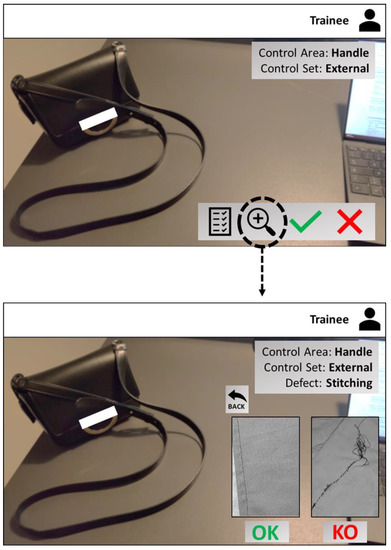 To clearly visualize the results mined through the association rules and speed up the quality control process, an AR application is foreseen. In addition, it will support the trainees overlaying real products with images of non-compliances to detect. To achieve these results, the application includes a different workflow according to the logged user (i.e., expert or trainee) in order to include additional information only for the ones who really need them. The areas to be controlled are shown on the screen one by one and ordered according to the defect occurrence within, leading the controller to firstly check the most critical parts of the product. This approach is expected to speed up the quality control process because the sooner the controller finds a case of non-compliance, the shorter the overall defect detection time. As the experts are aware of the non-compliance to be checked, only trainees are enabled to scroll the defects per product area, listed from the most to the least occurrent. Both the ordering criteria reflect the association rules mined to make more accurate and faster the defect prediction. In scrolling defects, the most occurrent (i.e., the ones with Conf exceeding the threshold value defined by the company) are highlighted to keep the user’s attention on them, reducing the time needed for their detection.