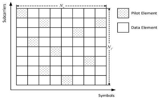 As shown in Figure 1, an OFDM block contains two types of elements, named pilot element and data element, respectively. In particular, prior known symbols are transmitted in the pilot elements to obtain the partial instantaneous channel state of the entire OFDM block, while the data symbols are delivered in the data elements. Define as the position indicator of pilot elements, or 1. Specifically, if , it indicates that the OFDM element located at i-th symbol and j-th subcarrier is used to transmit pilot symbols; otherwise, it means that the OFDM element belongs to the data element set. Then in (1) can be divided into two parts, which are the received pilot symbols and data symbols . Their expressions can be written as: