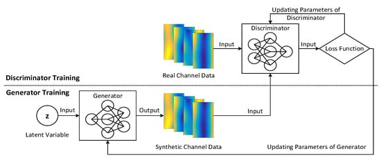 As shown in Figure 3, the general structure of GAN is depicted. It consists of two independent neural networks, which are named generator G and discriminator D [10], respectively. In particular, the generator aims to learn the mapping relationship from a latent variable z in low-dimensional space to the real data samples in high-dimensional space. In the ideal case, the trained generator can produce a large variety of different synthetic channel samples that follow the real data distribution. The key goal of discriminator is to distinguish whether the input data come from the real dataset. Generally, to achieve this goal, the output layer of the discriminator network is designed to be a sigmoid function such that a probability value labeling the input data can be obtained, . When approaches 1, it means that the input data sample is most likely to be a real data sample, while when approaches 0, it means that the input data sample, with high probability, belongs to the synthetic sample set.