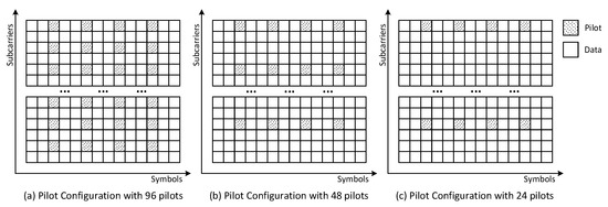 As shown in Figure 6, three types of pilot configurations with different numbers of pilots are considered in the evaluation of the channel estimation performance. To reduce the cost of pilots and ensure the efficiency of data transmission, the maximum number of pilot elements is limited to 96. In particular, the pilot positions are designed on the same columns for all three configuration schemes, which are the 3, 6, 9, and 12-th columns. The aim of configuring the sparse pilot pattern is to capture the fast-changing trend of the channel environment. The only difference between these three schemes is the row positions of pilots. Specifically, in the cases of pilot configurations (a), (b) and (c), the pilots are inserted every two rows, every four rows, and every eight rows, respectively.