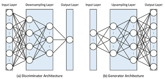 The architectures of discriminator and generator are illustrated in Figure 7a,b, respectively. As shown in this figure, both models are designed as fully connected networks with five linear layers. In the case of the discriminator, the input channel sample is flattened into a vector from the original matrix. Considering that the coefficient of the channel is with a complex form, an efficient way to handle this is to split it into the real and imaginary parts. In this experiment, the real part and the imaginary part are treated as two different samples. Hence, the input layer is still designed with neurons. The hidden layer consists of three downsampling layers, which contain 512, 256 and 64 neurons, respectively. The first four layers are each followed by a LeakyReLU active function and a LayerNorm normalized function. Finally, the output layer contains only one neuron followed by a sigmoid function, which outputs a probability to judge the authenticity of the input samples.