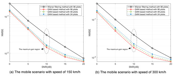 As shown in Figure 9, the evaluation for the accuracy performance of our proposed GAN-based channel estimation method is provided, where two mobile scenarios with speeds of 150 km/h and 300 km/h are considered in Figure 9a,b, respectively. In addition, the pilot configuration settings are given in Figure 6. In particular, the widely used conventional Wiener filtering interpolation method [30], a method that can achieve the MMSE criteria when SNR is high enough, is selected as the benchmark. The estimated data channels after Wiener filtering can be expressed as