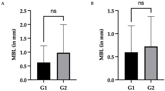 Marginal bone loss (MBL) in G1 (no bone augmentation) and G2 (bone augmentation) (A) all patients included in the study; (B) patients with peri-implantitis excluded. Error bars shown in this figure are means ± SD. The abbreviation non-significant (ns) is used for statistically nonsignificant, satistically significant at p ≤ 0.05.