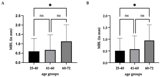 Marginal bone loss (MBL) in age groups. (A) all patients included in the study; (B) patients with peri-implantitis excluded. Error bars shown in this figure are means ± SD. The abbreviation ns is used for statistically nonsignificant, * statistically significant at p ≤ 0.05.