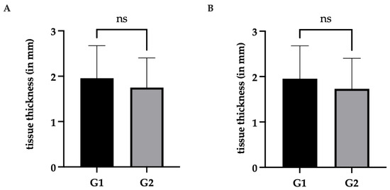 The thickness of keratinized tissue (TKT) in G1 (no bone augmentation) and G2 (bone augmentation). (A) all patients included in the study; (B) patients with peri-implantitis excluded. Error bars shown in this figure are means ± SD. The abbreviation ns is used for statistically nonsignificant, statistically significant at p ≤ 0.05.