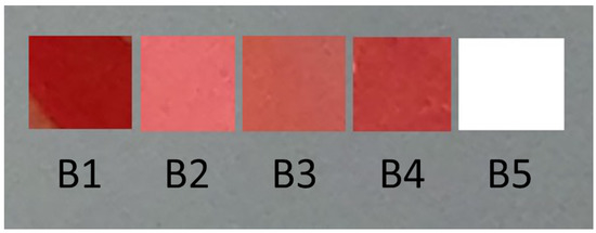 The dyes used in permanent makeup were implemented on the skin of the pig’s ear, which is structurally the most similar to human skin. 5 different colors were implemented into the examined skin fragment using a micropigmentation device (Conture-Linner-Duo; Long-Time-Liner, Germany). For lip pigmentation: red shade (B1), light pink shade (B2), nude (B3), and dirty pink shade (B4) were used. The control dye was white (B5) (Figure 1). The characteristics based on RGB, CMYK, and L*a*b* color scales of the dyes used before the laser procedure is shown in Table 1.