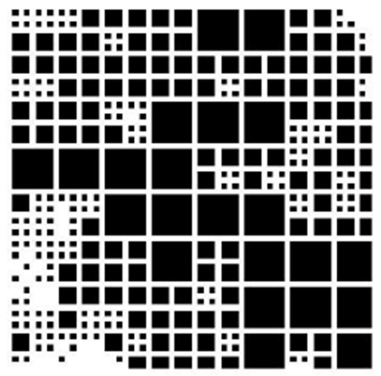 The quadratic tree decomposition was used to analyze the homogeneity of the dye distribution. This algorithm, also known as QTDECOMP, divides an image of certain dimensions by a power of 2, e.g., 256 × 256. This is a method where a square image is divided into 4 equal-sized square blocks. Then each block is tested to see if it meets the arbitrary criterion of the brightness difference between the blocks. If the criterion is met, the block is not divided any further. If the criterion is not met, the block is subdivided again into 4 blocks. This process is repeated until each block meets the criterion. The final effect of the quadratic tree decomposition can be blocks of different sizes (Figure 4). In this study, the arbitrarily adopted threshold for the difference in brightness was 8 [32].