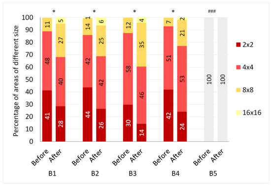 Each of the dyes was analyzed by the quadratic tree decomposition algorithm before and after the Q-switched Nd:YAG laser application. All images were divided into 2 × 2, 4 × 4, 8 × 8, and 16 × 16 areas, and their number was calculated. Then, the percentage of areas of a certain size from the total number of areas in the image of each dye was calculated. It was shown that after using the laser, the percentage of large areas (8 × 8 and 16 × 16) increased significantly (p < 0.001) compared to smaller ones (2 × 2 and 4 × 4) in each of the colored dyes (B1–B4) (Figure 5). The B5 white dye was fully homogeneous for the arbitrarily adopted homogeneity criterion, and the use of the laser did not significantly affect its homogeneity.