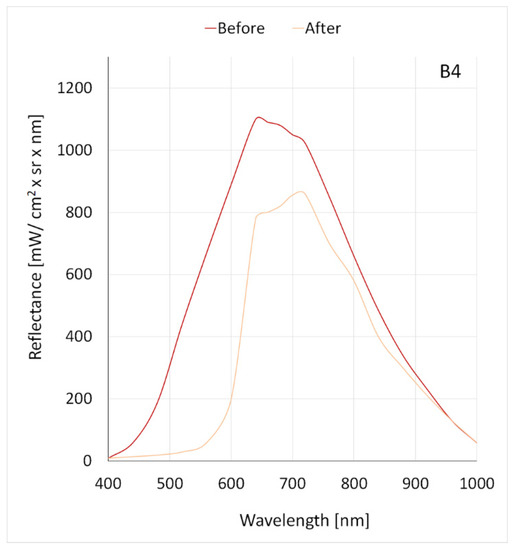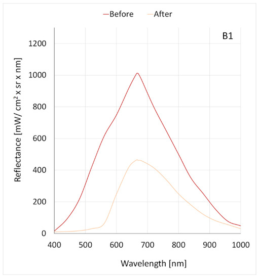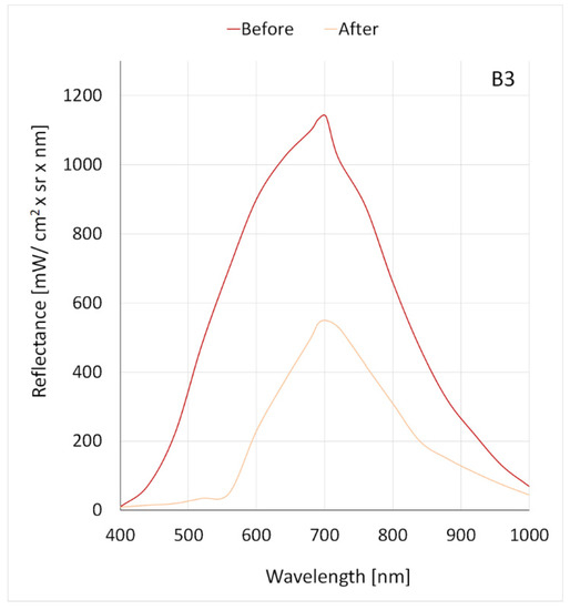 The second largest difference in reflectance before and after the laser application applied to dye B3, in which a decrease in maximum reflectance from 1140 mW/cm2 × sr × nm to 550 mW/cm2 × sr × nm was observed at a wavelength of 702 nm (Figure 8, Table 2). For the B4 dye, the maximum reflectance decreased from 1110 mW/cm2 × sr × nm to 860 mW/cm2 × sr × nm (Figure 9, Table 2). Dye B4, among other dyes, was characterized by the smallest difference in reflectance before and after the laser application.