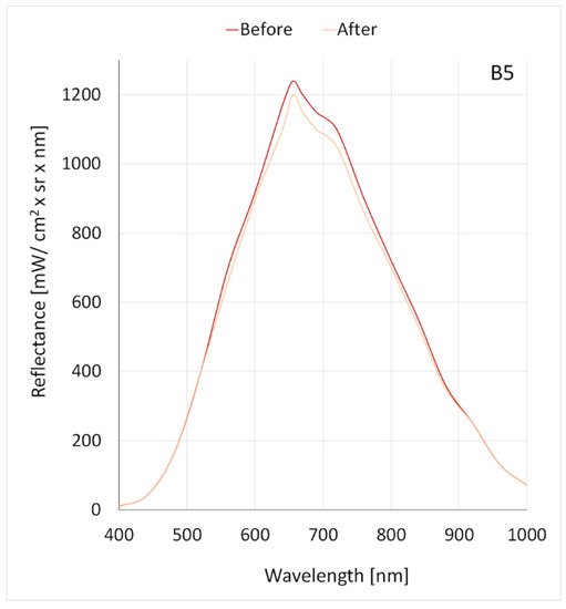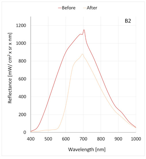 Regarding B5 white dye, a minimum difference in reflectance was observed; the maximum value of coefficient decreased from 1240 mW/cm2 × sr × nm to 1200 mW/cm2 × sr × nm at a wavelength of 665 nm (Figure 10, Table 2).
