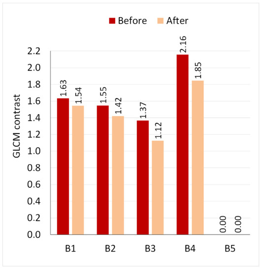 Contrast in GLCM analysis before and after laser application.