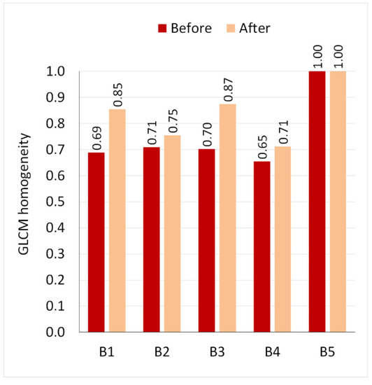 Homogeneity in GLCM analysis before and after laser application.